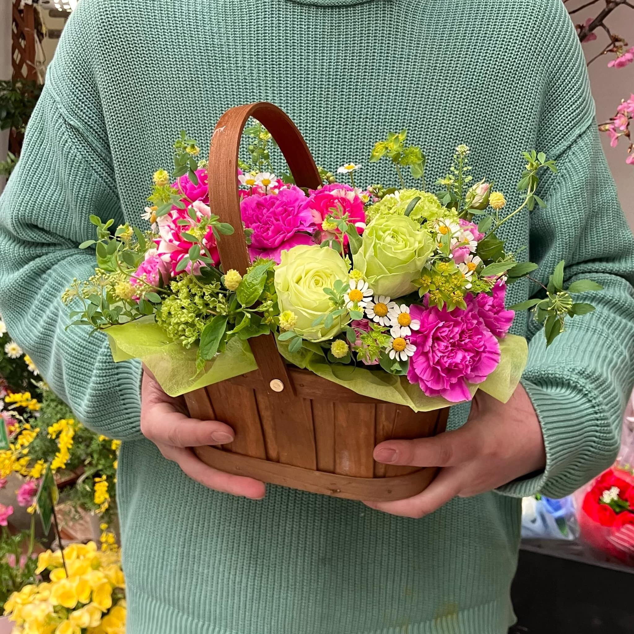 カーネーションやバラを使った、爽やかなデザインのアレンジメントです。