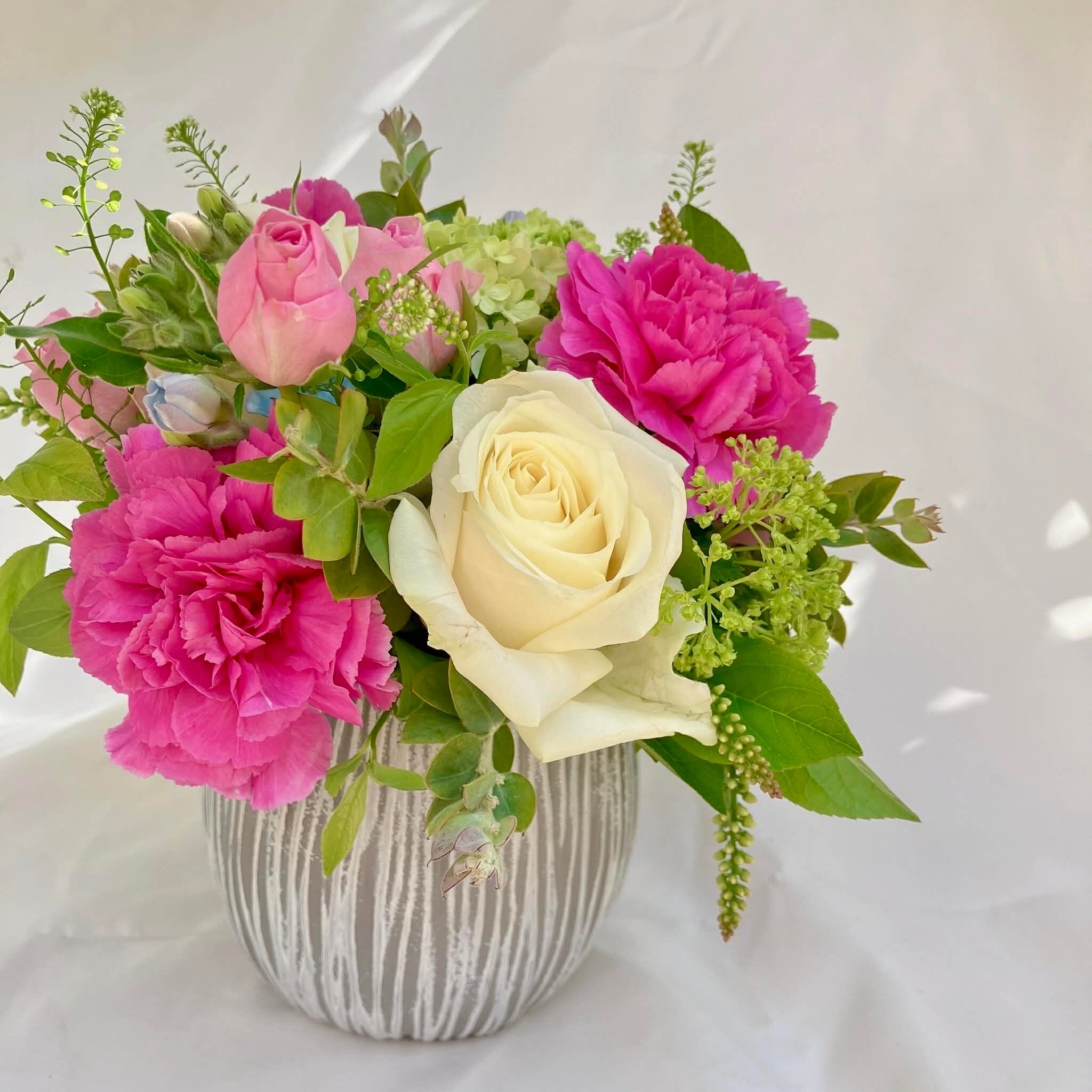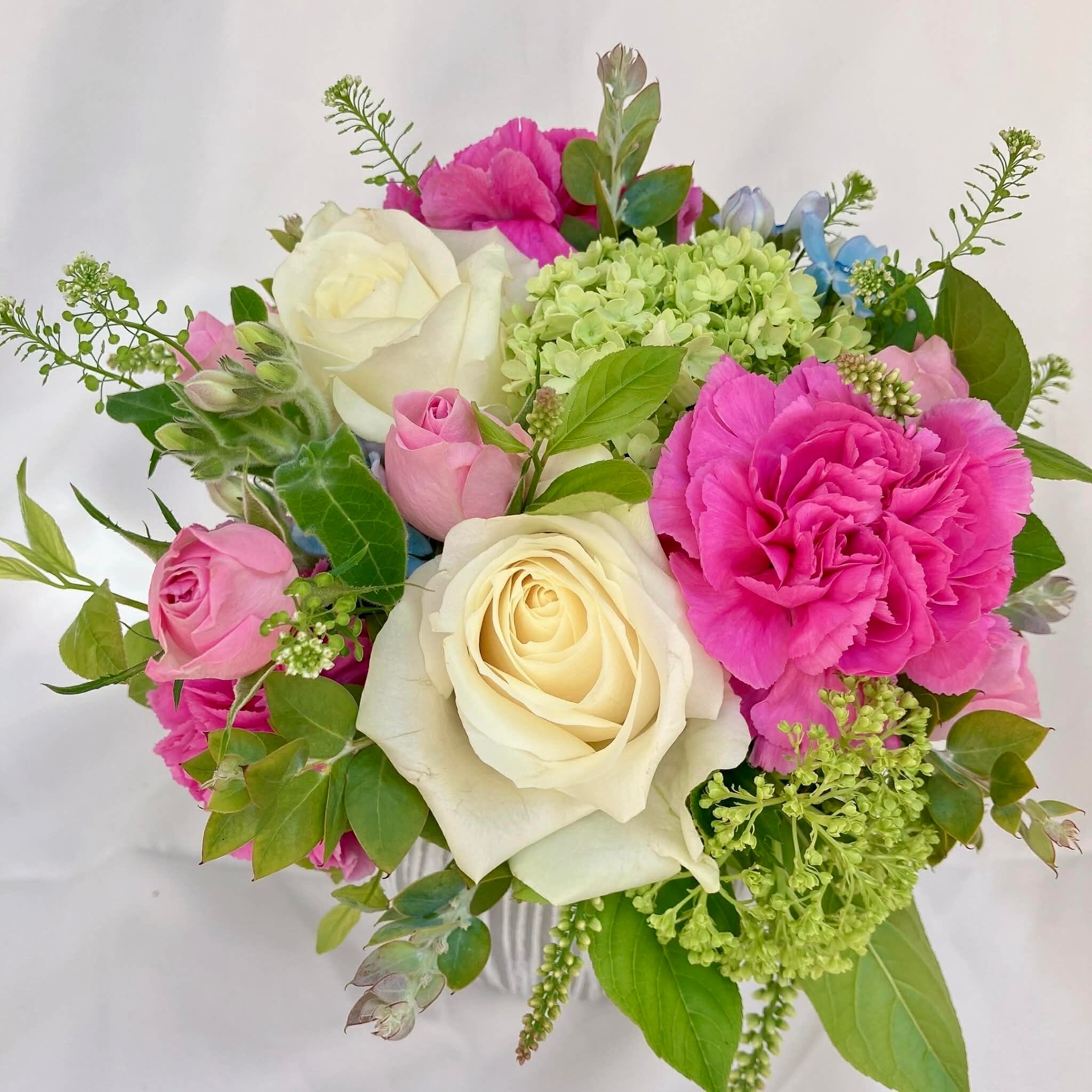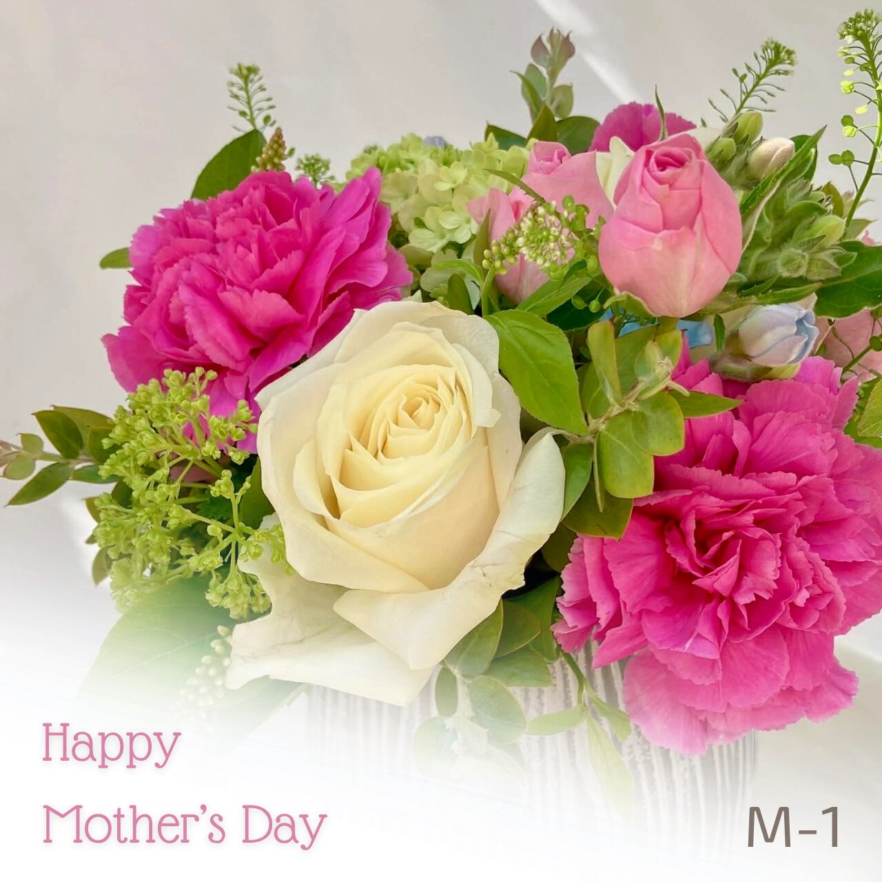 ふんわりと優しい色合いのバラやカーネーションを使った、母の日限定のミニアレンジメントです。