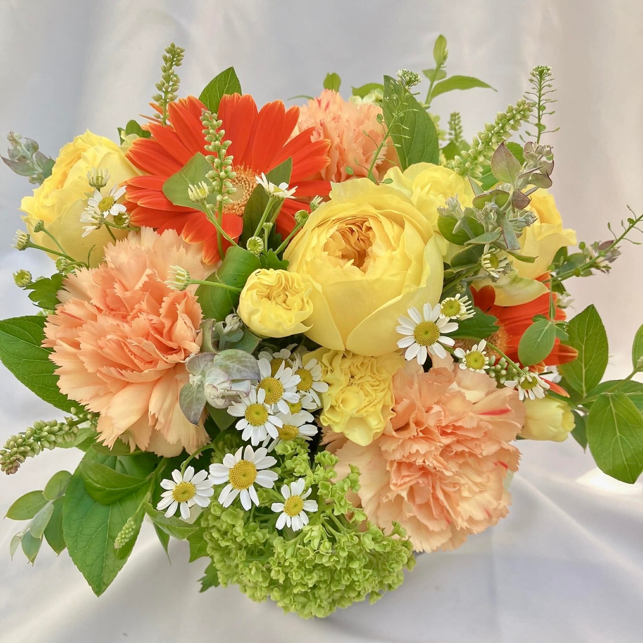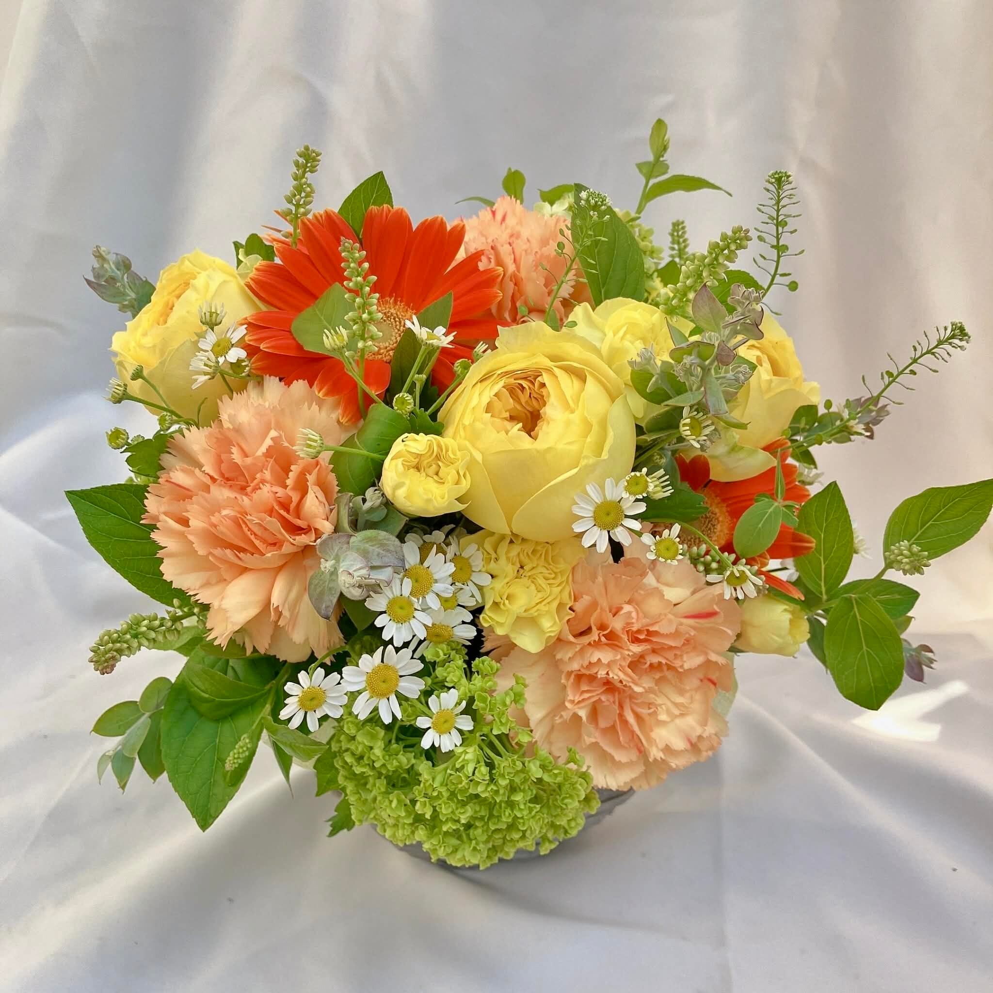 明るい黄色やオレンジの花々を使った、母の日限定のアレンジメントです。