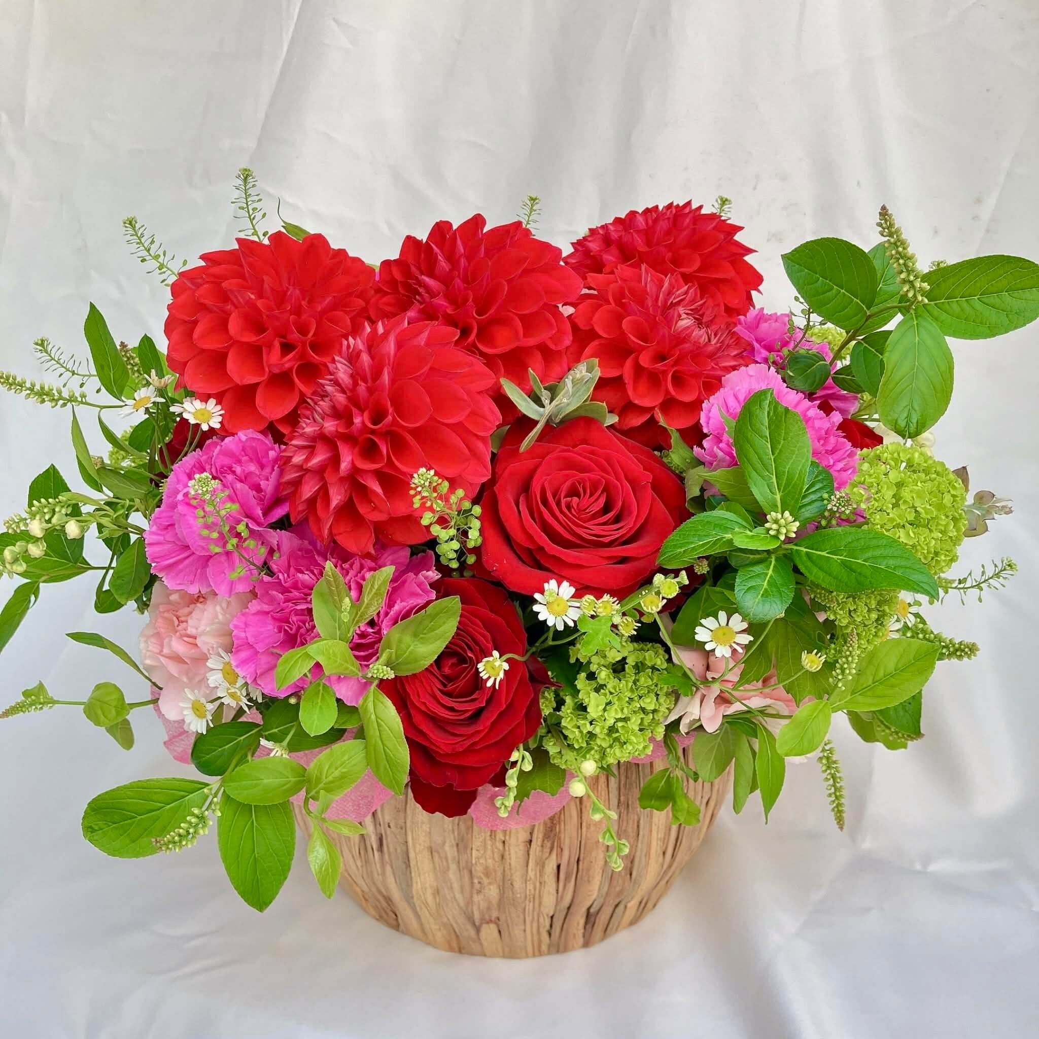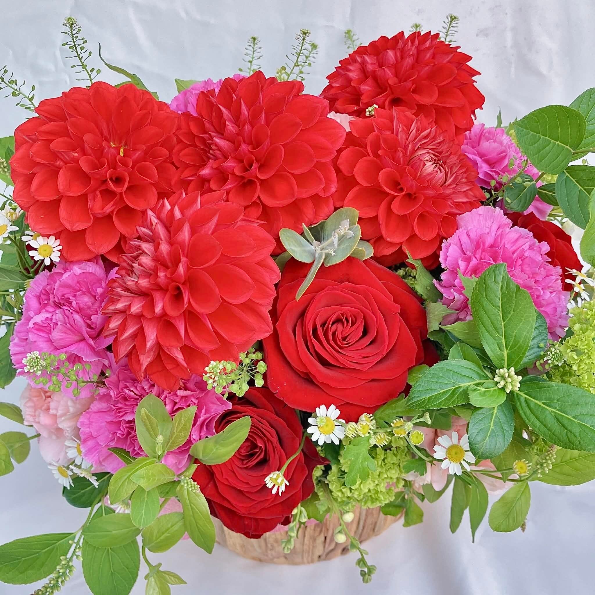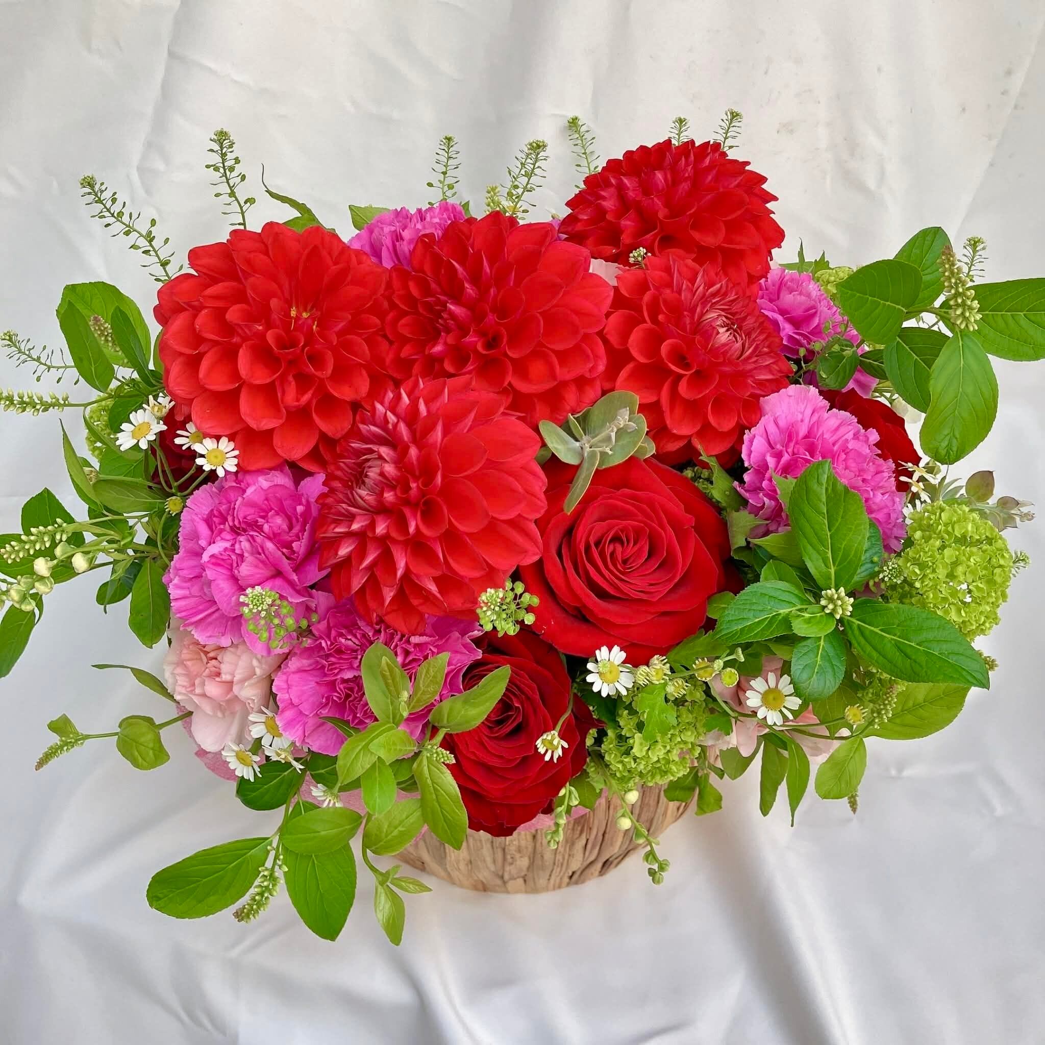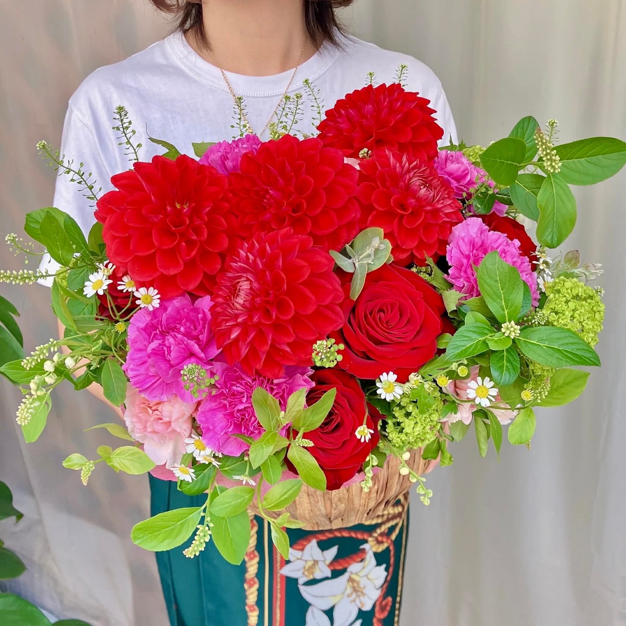 深い赤のダリアとバラを主役に、カーネーションや小花を使った華やかな母の日アレンジです。