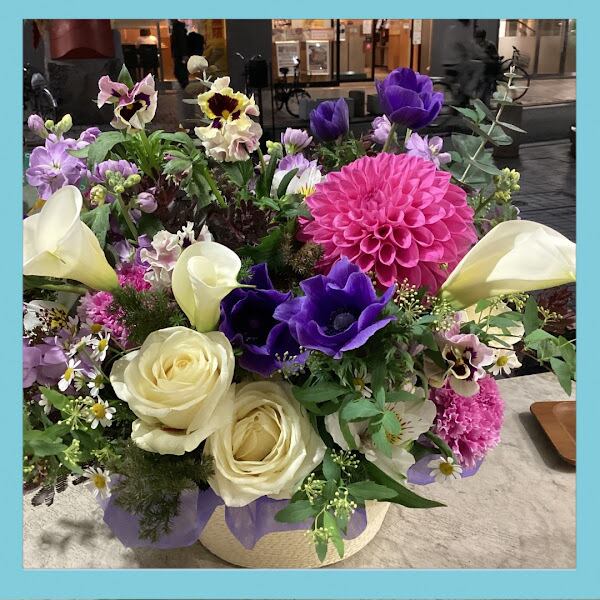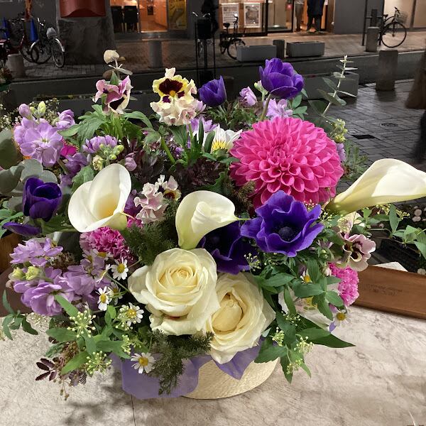 使用花材→ダリア、カラー、バラ、アネモネ、パンジー