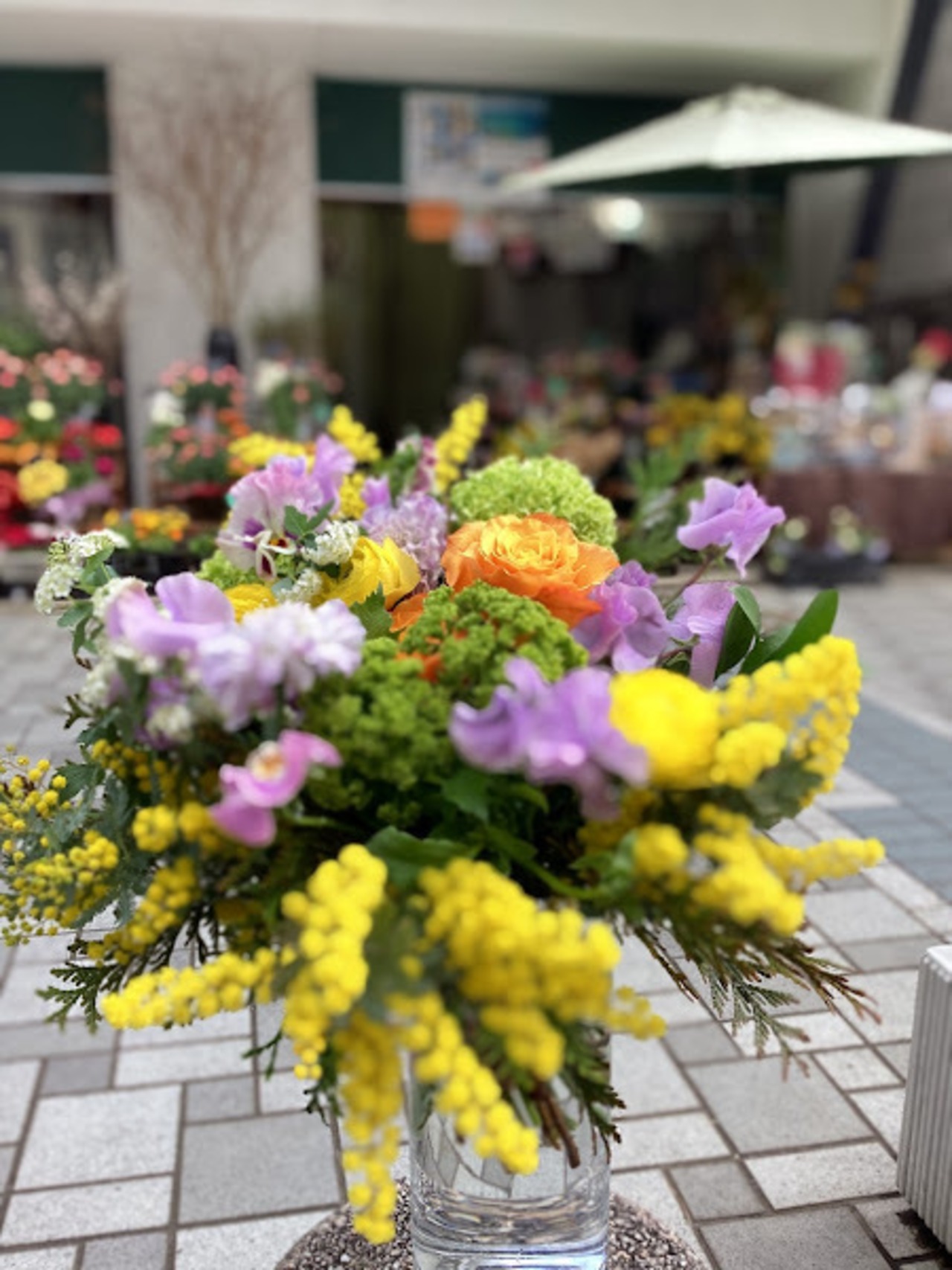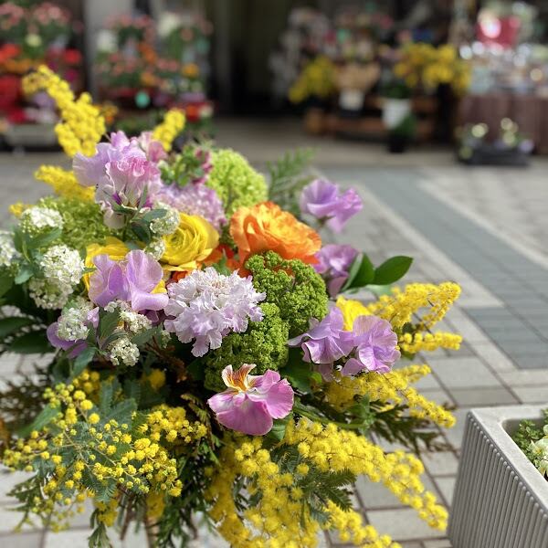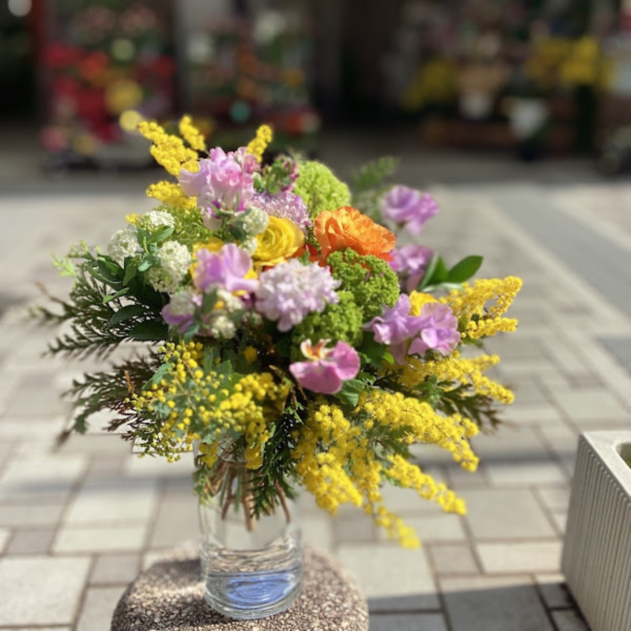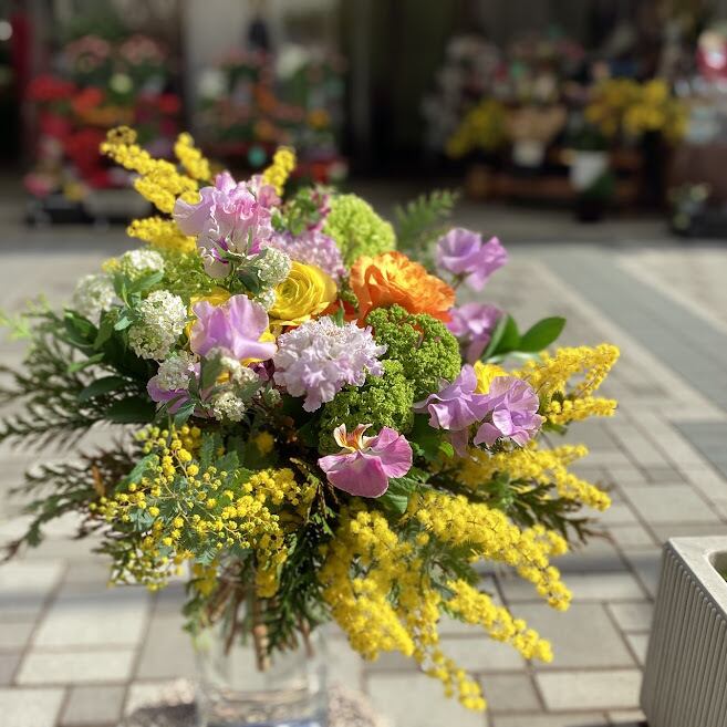 花材、ミモザアカシア、ラナンキュラス、スイートピー、ビバーナム、コデマリ、バラ