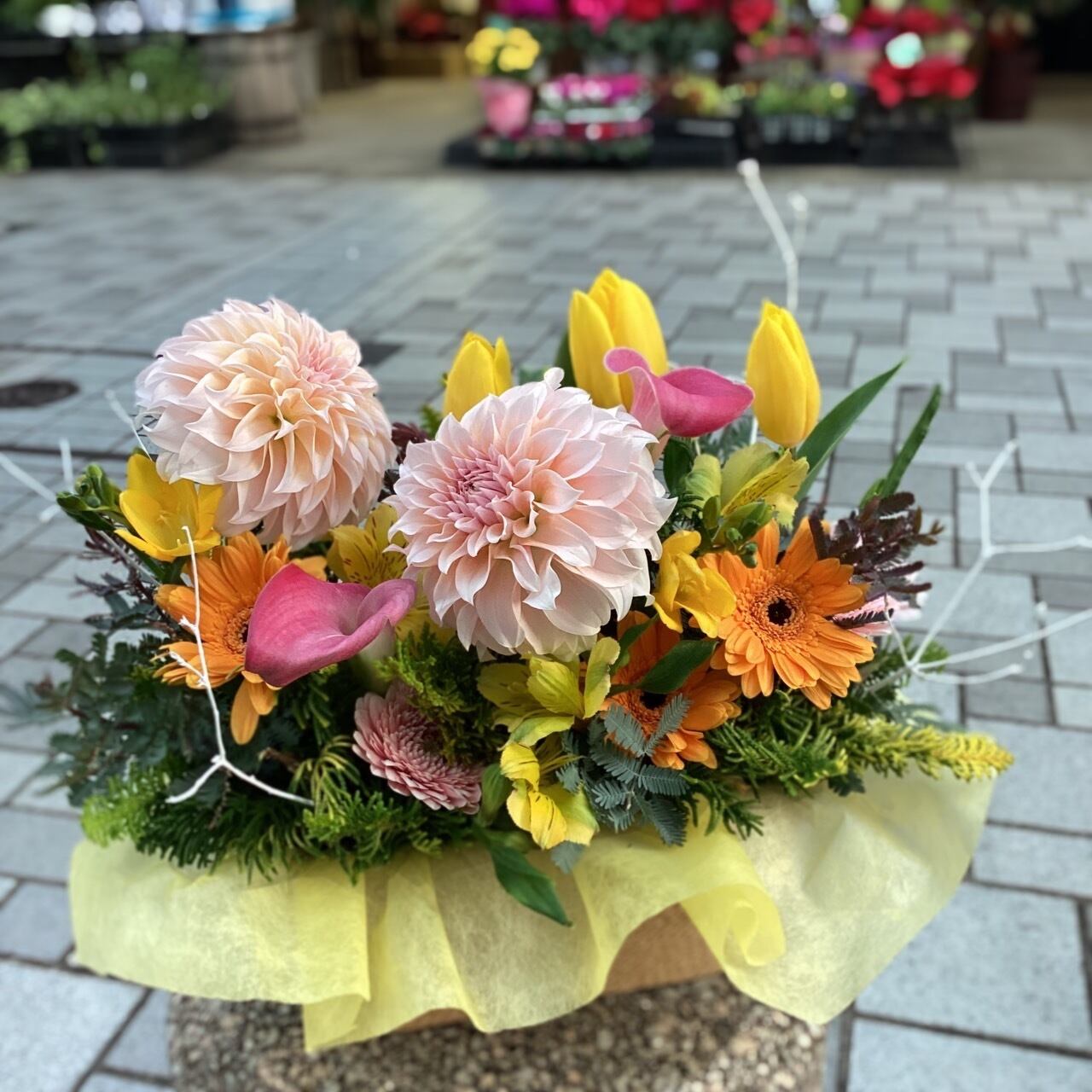 ダリア、チューリップなど明るめにご用意致しました。